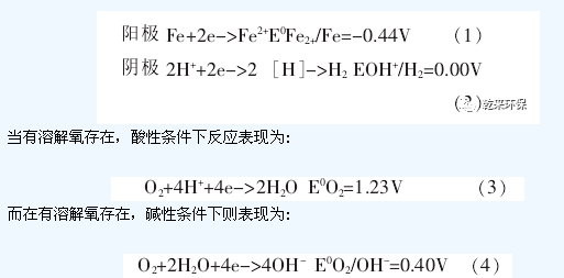 所用材料的鑄鐵屑和活性碳或焦碳,鑄鐵屑是鐵和碳的合金,其內(nèi)部主要由純鐵和碳化鐵(Fe3C)組成,其中Fe3C以極為細(xì)小的微粒分散在鐵屑內(nèi)。當(dāng)將鑄鐵鐵屑浸沒(méi)在電解質(zhì)溶液中時(shí),由于Fe3C比純鐵更耐腐蝕,二者之間存在著明顯的氧化還原電勢(shì)差,這樣便在純鐵和碳化鐵之間形成了無(wú)數(shù)多個(gè)細(xì)微原電池,純鐵為陽(yáng)極,F(xiàn)e3C為陰極。另一方面鐵屑與活性碳形成較大的原電池,鑄鐵為陽(yáng)極,碳為陰極,使鐵屑在受到微原電池腐蝕的基礎(chǔ)上,又受到較大原電池的腐蝕。在這些細(xì)微原電池中,陽(yáng)極在電池反應(yīng)中表現(xiàn)為失去電子被氧化,而陰極得到電子被還原,但反應(yīng)比較復(fù)雜。在微電池中電極反應(yīng)為: